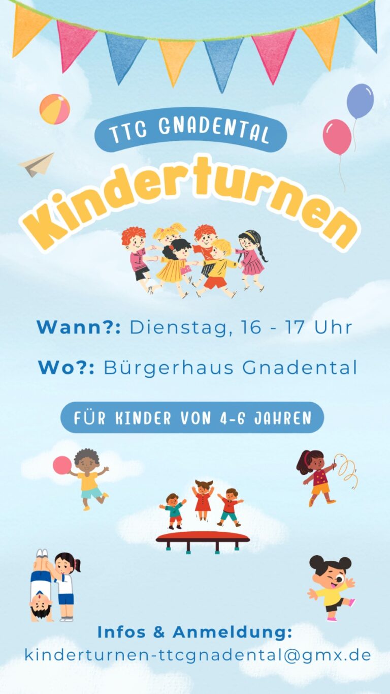 Jeden Montag und Dienstag, jeweils von 16 bis 17 Uhr bietet der TTC im Gnadentaler Bürgerhaus Kinderturnen für 4 bis 7 jährige Kids an. Einfach vorbeikomemn und ausprobieren.